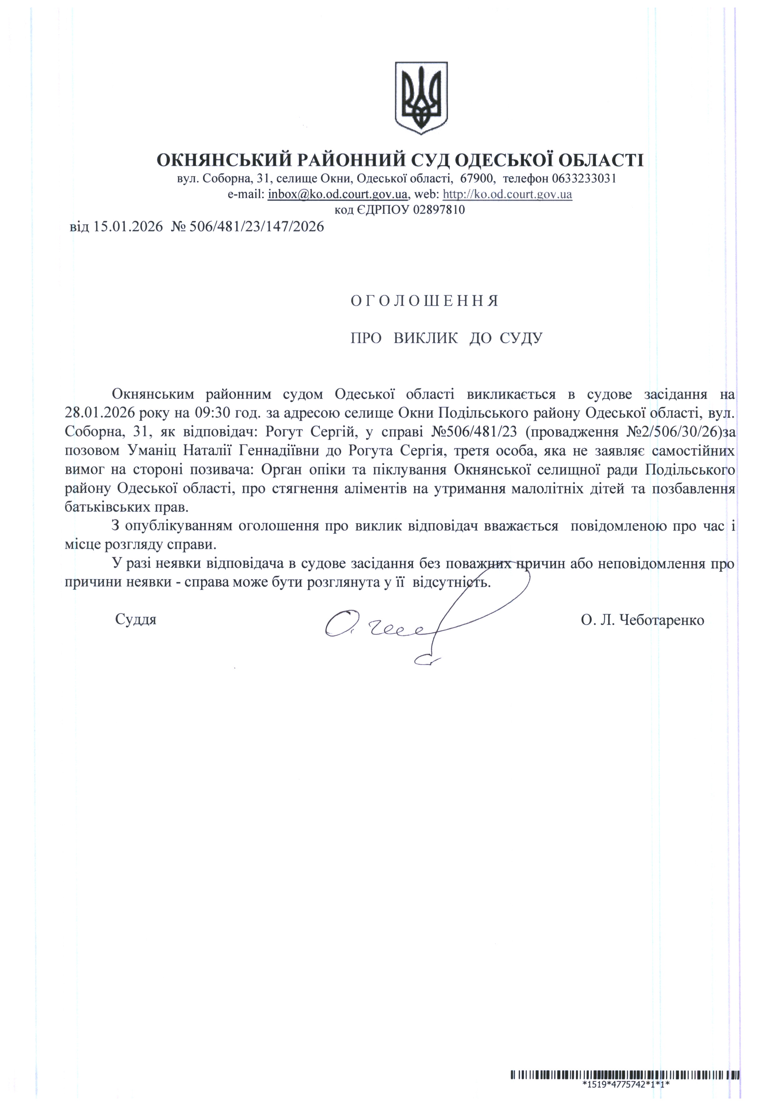 Оголошення про виклик до суду: Рогут С.