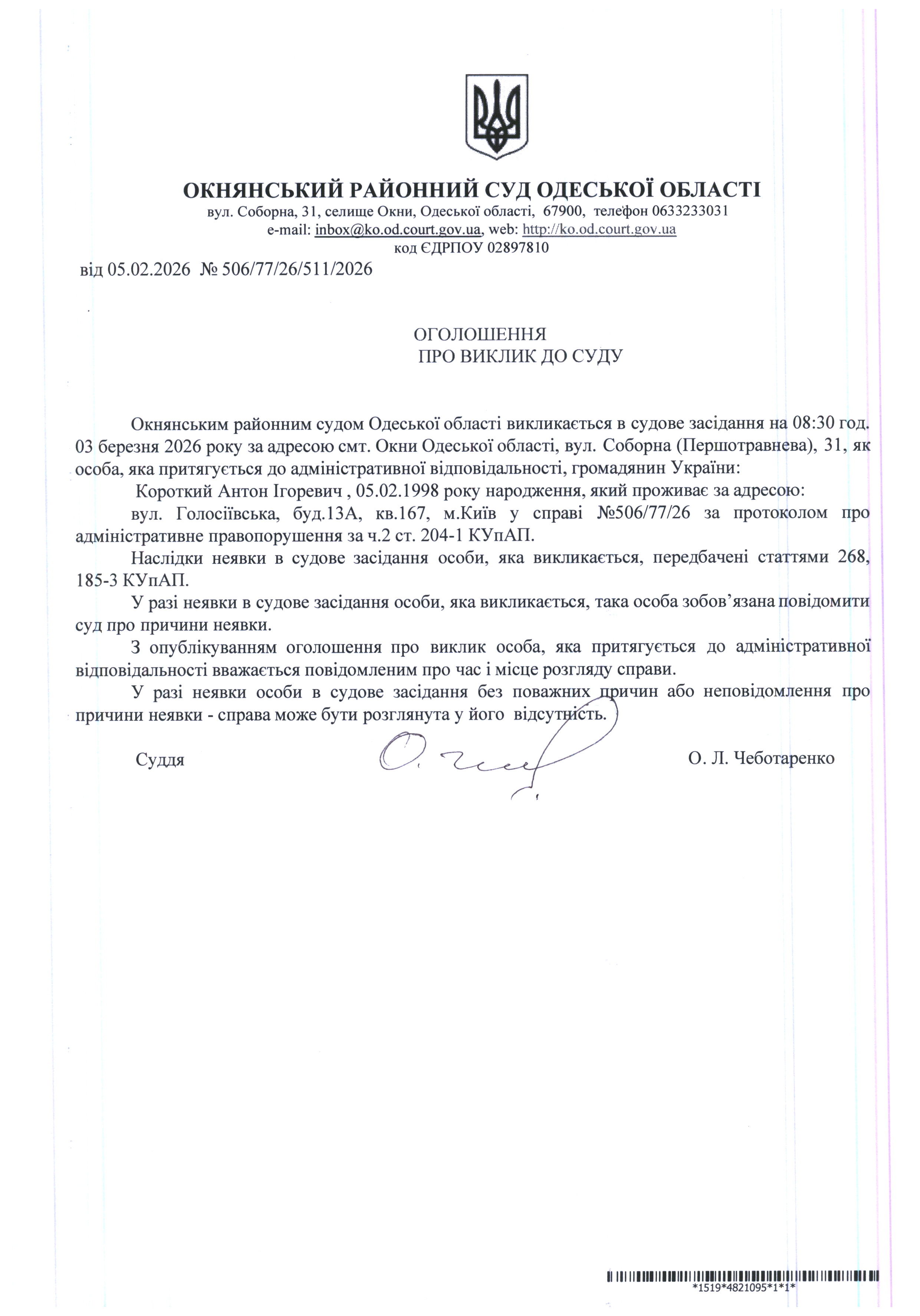 Оголошення про виклик до суду: Короткий А.І.