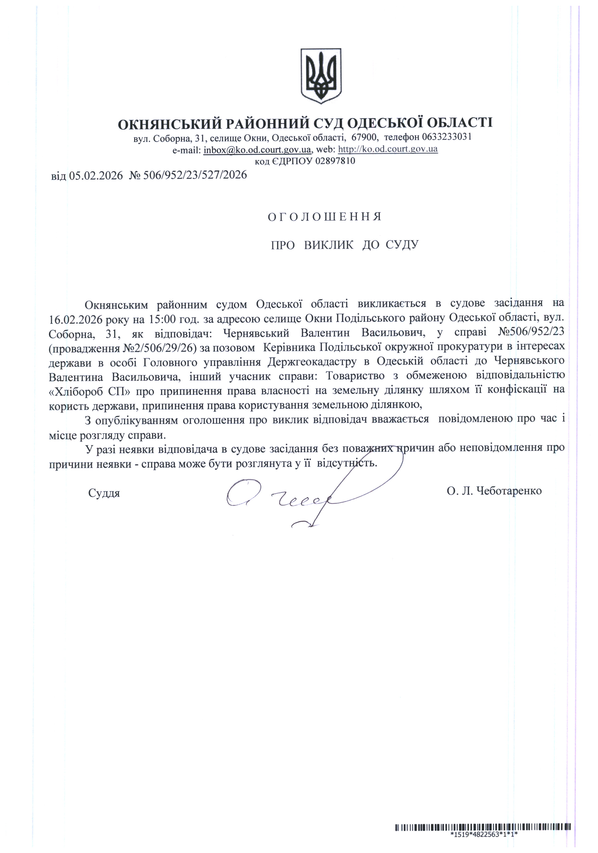 Оголошення про виклик до суду: Чернявський В.В.