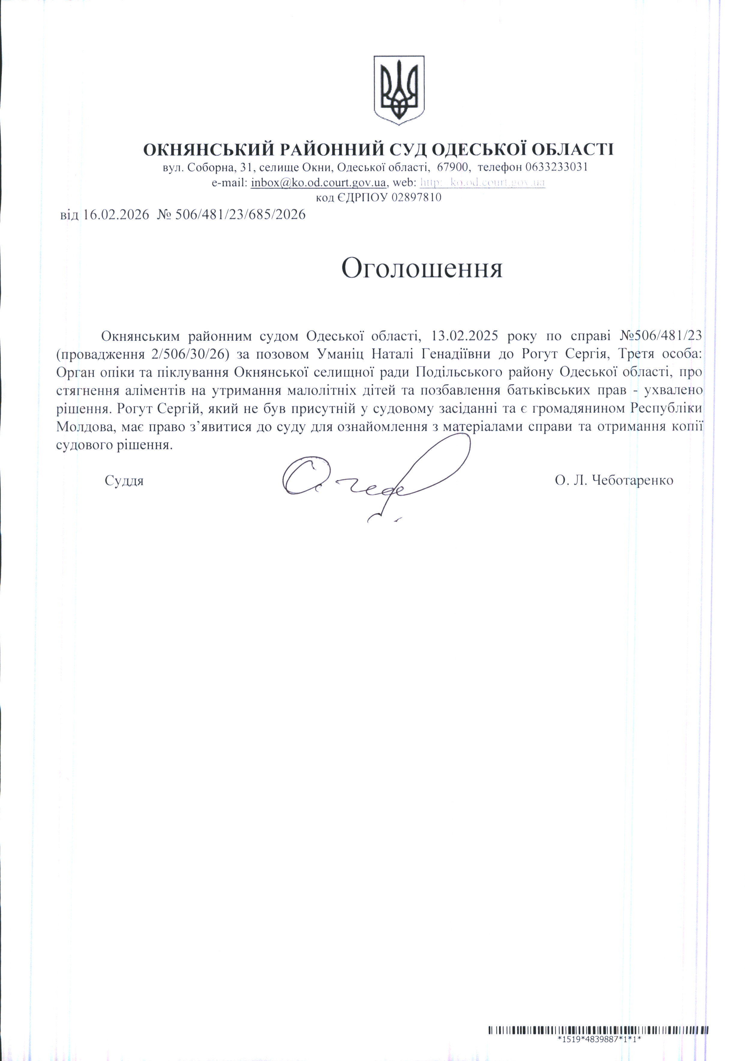 Оголошення про ухвалення рішення: Уманіц Н.Г. до Рогута С.