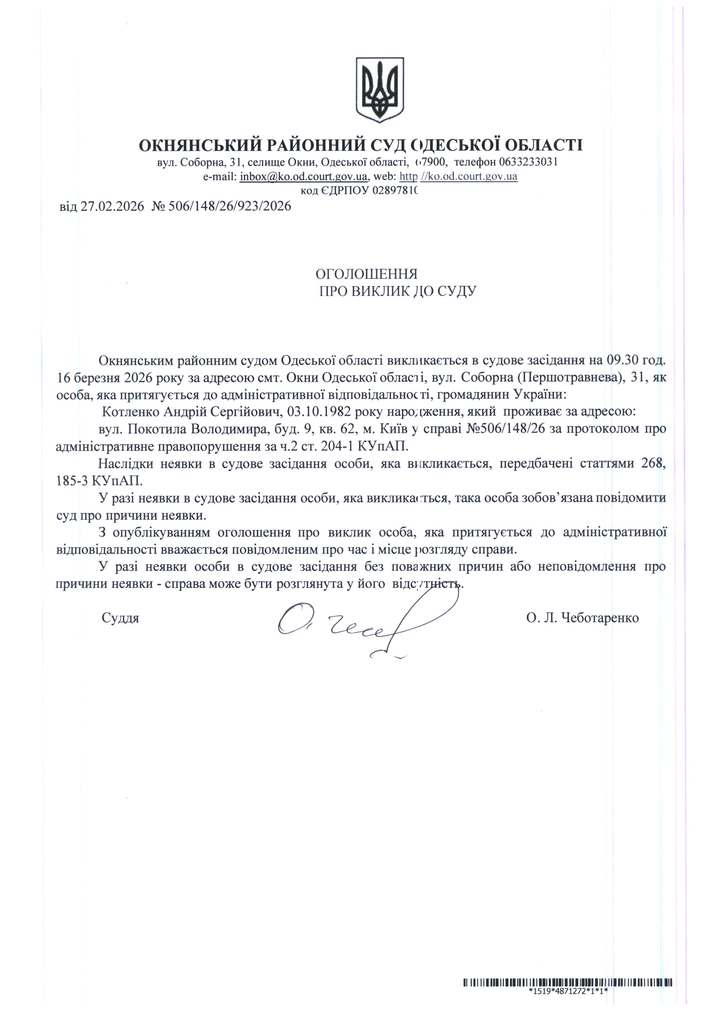 Оголошення про виклик до суду: Котленко А.С.