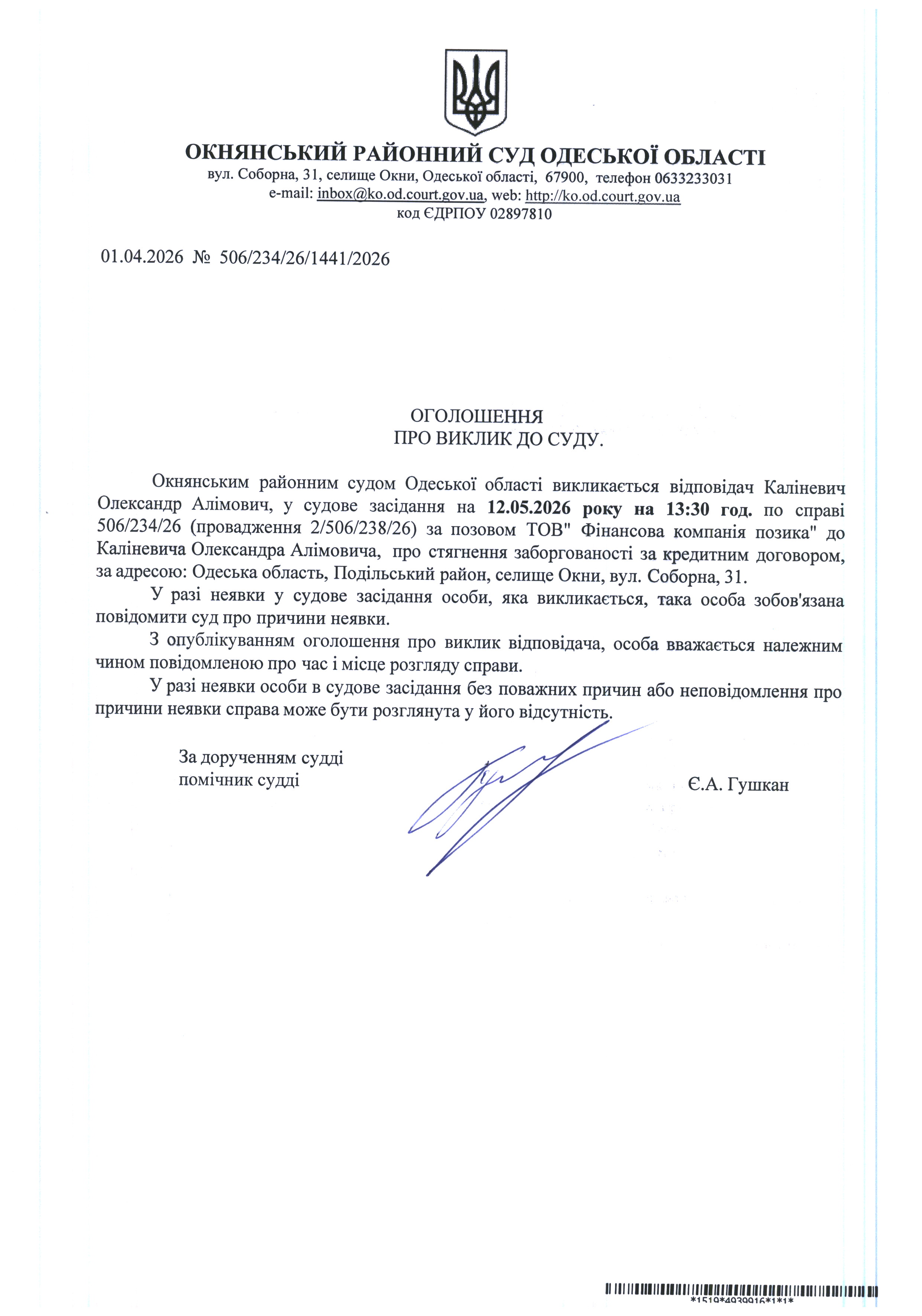 Оголошення про виклик до суду: Каліневич О.А.