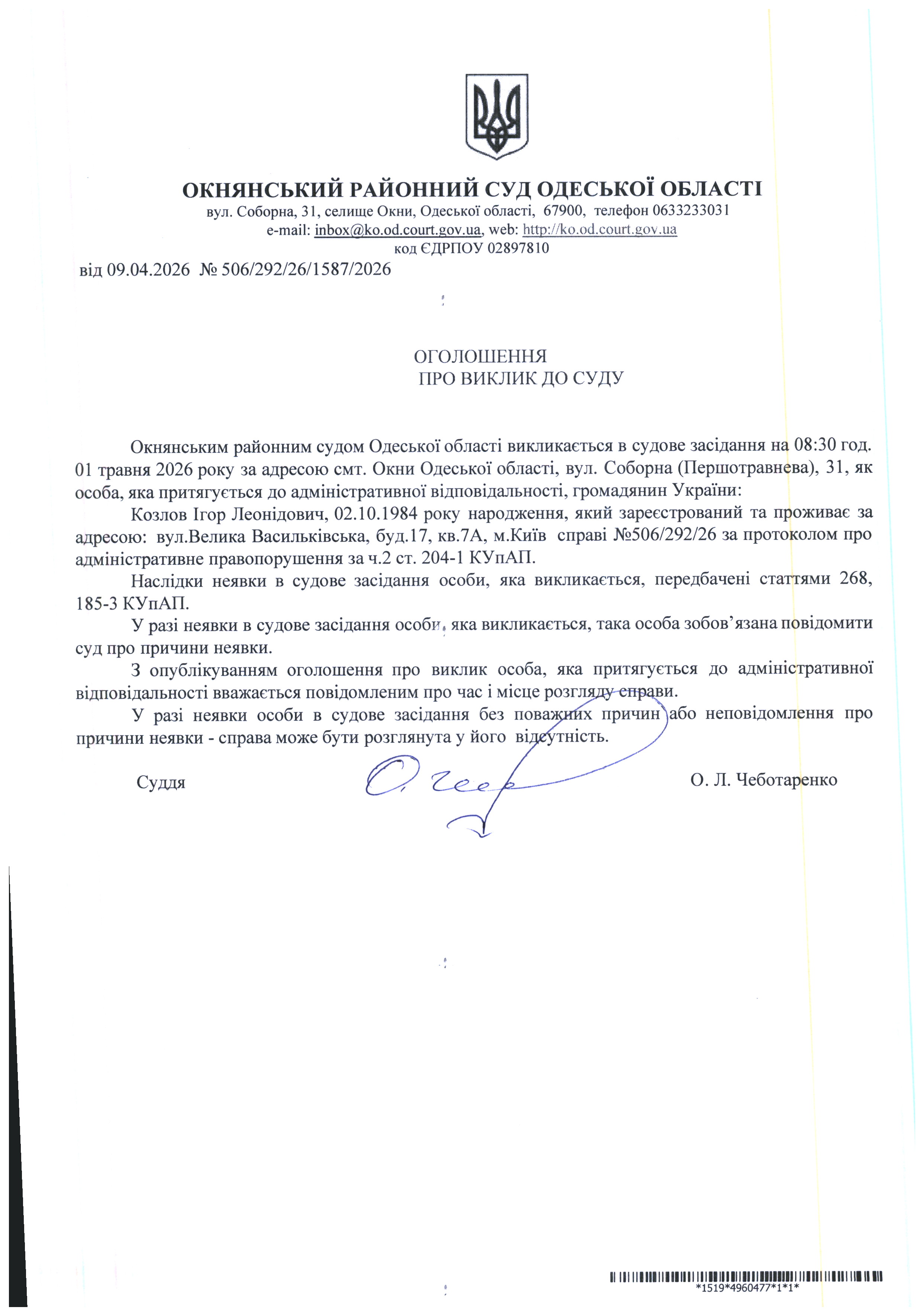 Оголошення про виклик до суду: Козлов І.Л.