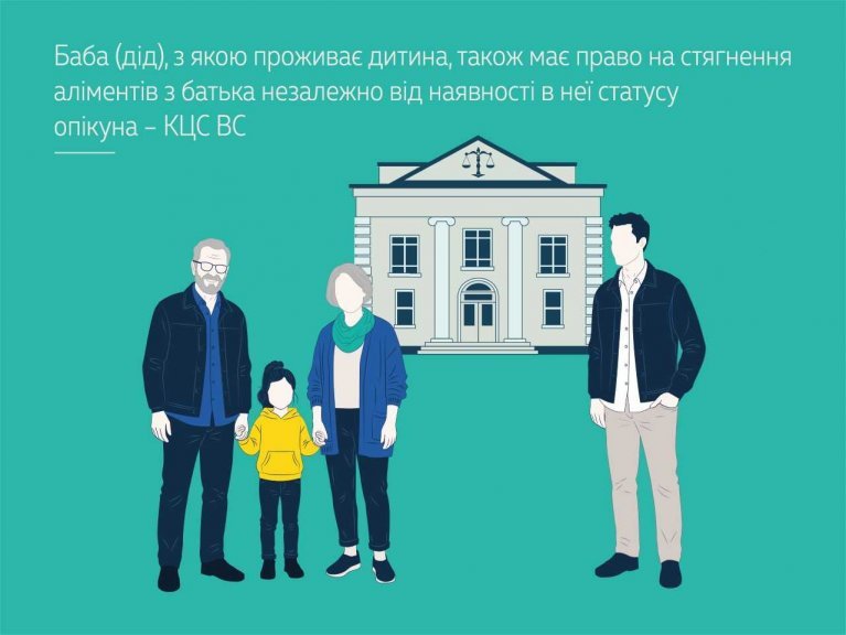 Суд касаційної інстанції роз’яснив, що за правилами ст. 258 СК України баба та дід мають право на захист інтересів своїх онуків у суді без спеціальних на те повноважень на підставі самого факту близького кровного споріднення. Це право на процесуальне представництво не потребує обов’язкового встановлення опіки чи піклування, тому баба, з якою фактично проживає дитина, має право на подання позову про стягнення аліментів з батька дитини.